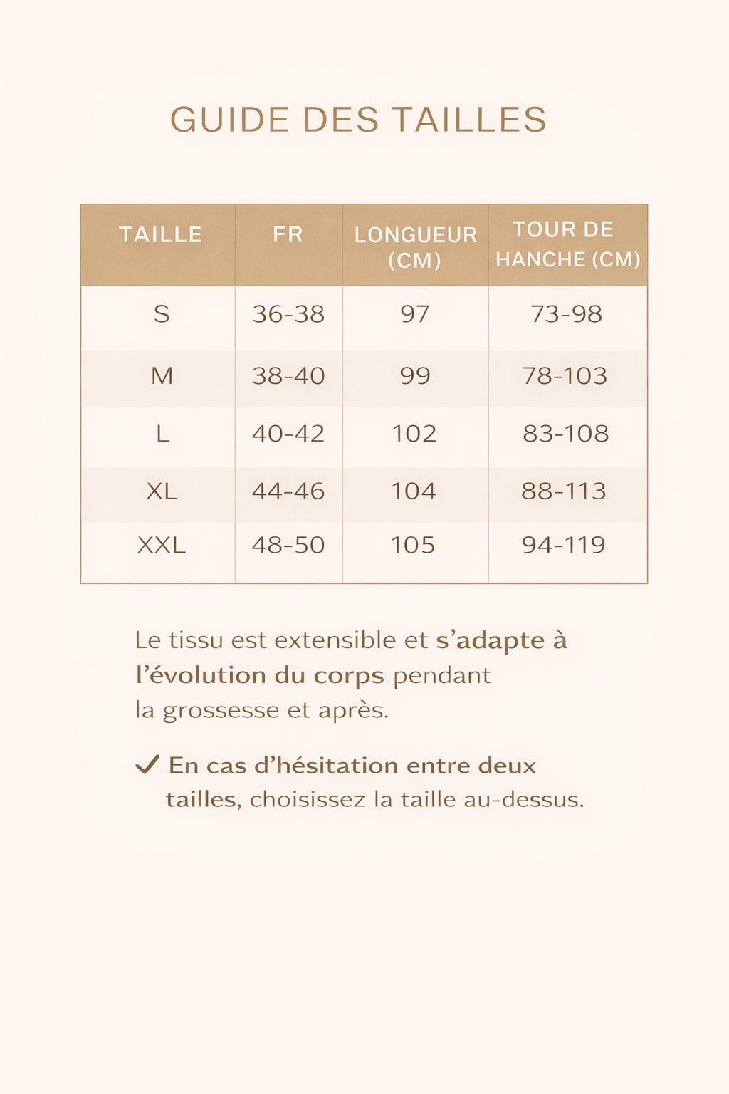 🛈 Le tissu est extensible et s’adapte à l’évolution du corps.